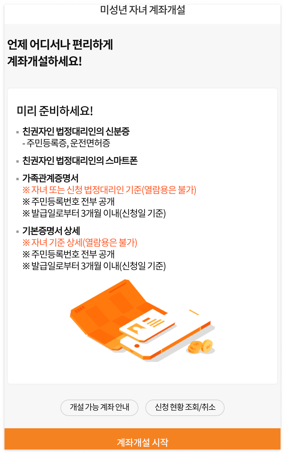 미래에셋증권 어플에서 아이들 계좌를 비대면으로 개설했는데, 해당 사이트 첫 화면에 준비해할 서류와 증명서 제출 시 챙겨야 할 필수 부분이 사전 공지 되어 있으니 미리 준비하고 계좌를 개설하자