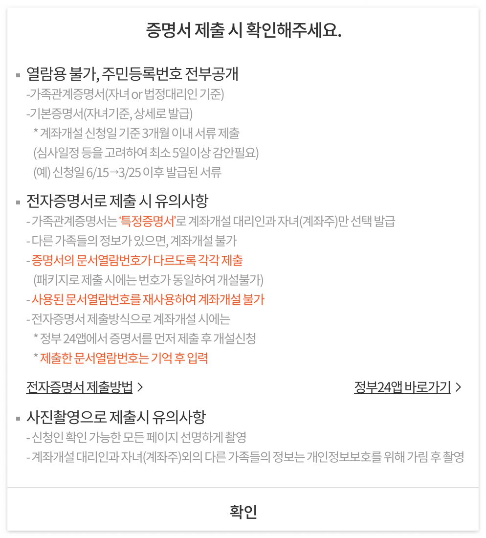 미래에셋증권 어플에서 아이들 계좌를 비대면으로 개설했는데, 해당 사이트 첫 화면에 준비해할 서류와 증명서 제출 시 챙겨야 할 필수 부분이 사전 공지 되어 있으니 미리 준비하고 계좌를 개설하자
